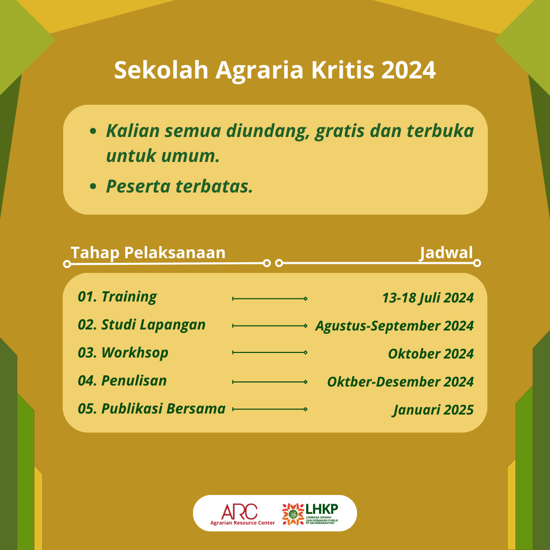 ARC bekerjsama dengan LHKP PP Muhammadyah kali ini menyelenggarakan Sekolah Agraria Kritis (SAK) 2024 dengan tema “Perubahan Agraria, Reorganisasi Kapital, dan Pembentukan Subyek Kriminal”. SAK 2024 akan membekali peserta dengan perspektif teoritik dan perangkat analisa kriminologi kritis untuk meneropong asal-asul dan praktek pembentukan subyek kriminal bersamaan dengan perkembangan kapitalisme.