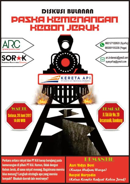 Sebuah catatan diskusi tematik mengenai perjuangan warga Kel. Kebon Jeruk, Kota Bandung menghadapi klaim PT. KAI atas tanah yang mereka gunakan sebagai tempat tinggal. Diskusi dilaksanakan tanggal 20 Juli 2017 di Sekretariat ARC, Jl. Ski Air, Arcamanik, Kota Bandung. Catatan diskusi oleh MS.