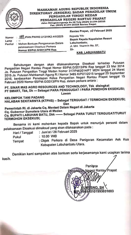 Saat ini berdasarkan surat dari Ketua Pengadilan Negeri Rantau Prapat, tertanggal 20 Februari 2025 perihal minta pengamanan dalam pelaksanaan eksekusi berdasarkan putusan pengadilan, akan malakukan eksekusi terhadap lahan kami. Untuk merespon hal tersebut kami ingin menyampaikan:
